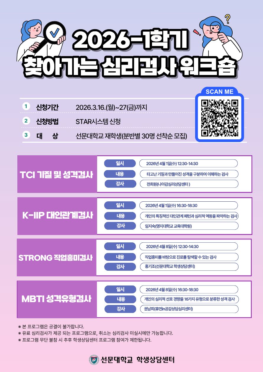 [학생상담센터] 2026-1학기 찾아가는 심리검사 워크숍 참여자 모집